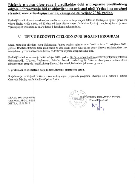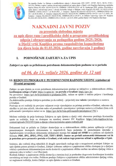 Naknadni javni poziv za preostala slobodna mjesta za upis djece u Dječji vrtić Kapljica